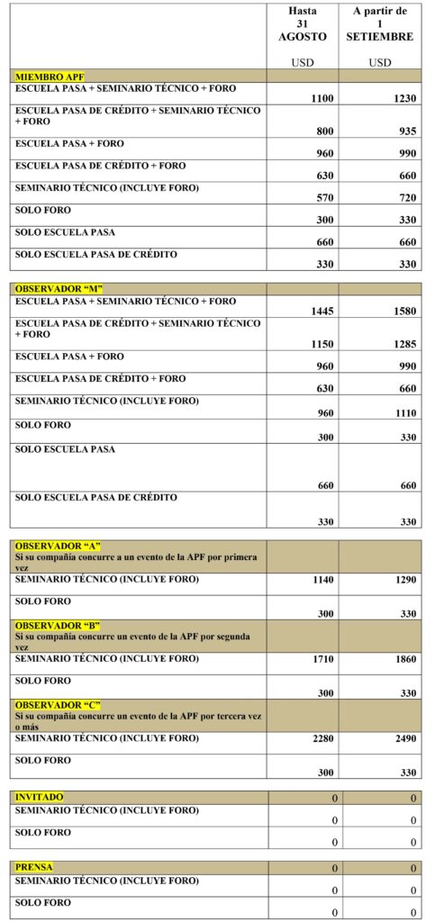 - Observador C: compañía no miembro que participa por tercera vez y en adelante en un evento organizado por APF.